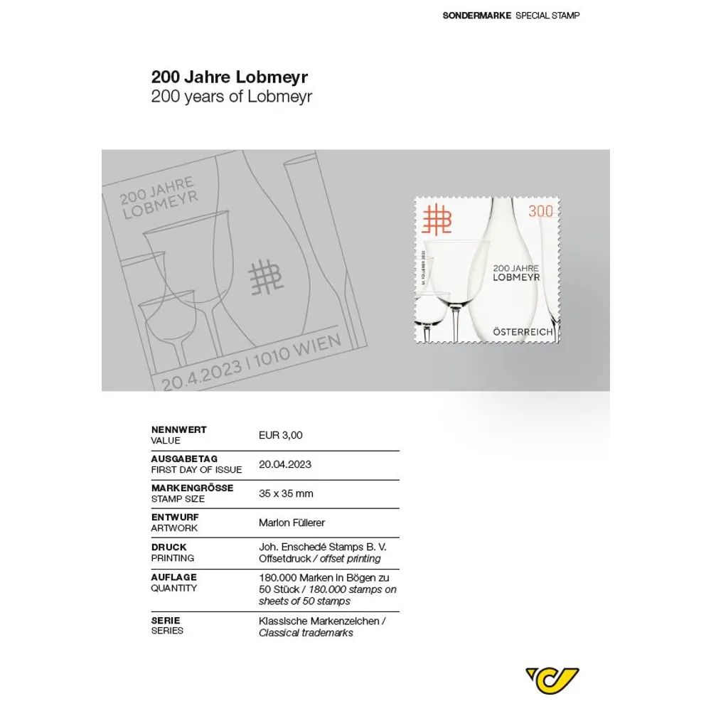 Seit 200 Jahren wird bei Lobmeyr in Wien Glas in vielfältigen Formen hergestellt. Zu diesem großen Jubiläum gratuliert die Österreichische Post mit einer Sondermarke aus der Serie „Klassische Markenzeichen“.