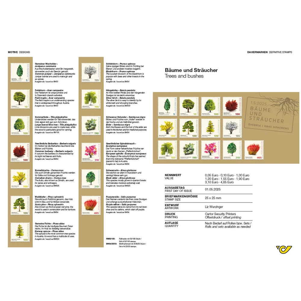 Nach der Dauermarkenserie „Trachten – Beiwerk und Auszier“, die sich mit einem traditionsreichen österreichischen Kulturgut befasst hat, ist die neue Serie der Österreichischen Post der Natur gewidmet. Bäume und Sträucher sind unverzichtbar für Mensch und Tier: Sie produzieren etwa den Sauerstoff, den wir zum Atmen brauchen. Zudem liefern sie einen enormen Beitrag zum Klimaschutz, denn sie können große Mengen schädlicher Treibhausgase speichern. Sie spenden Schatten und kühlen, sie speichern Wasser, sie sind Lebensraum für unzählige Pflanzen und Tiere und sorgen für ein gesundes Ökosystem – und nicht zuletzt haben Wälder auch immense Bedeutung als Erholungsraum.
