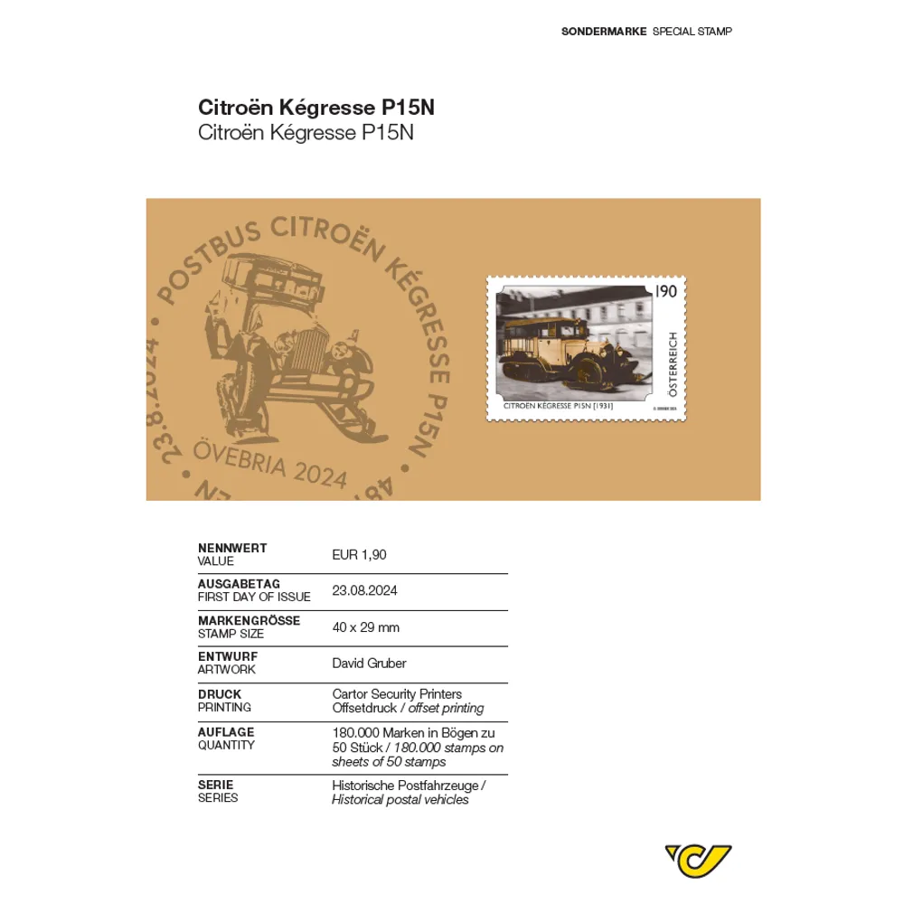 Ein ausgefallener Postbus für winterliche Straßenverhältnisse ist das diesjährige Motiv aus der Serie „Historische Postfahrzeuge“: ein Citroën Kégresse P15N aus dem Jahr 1931.