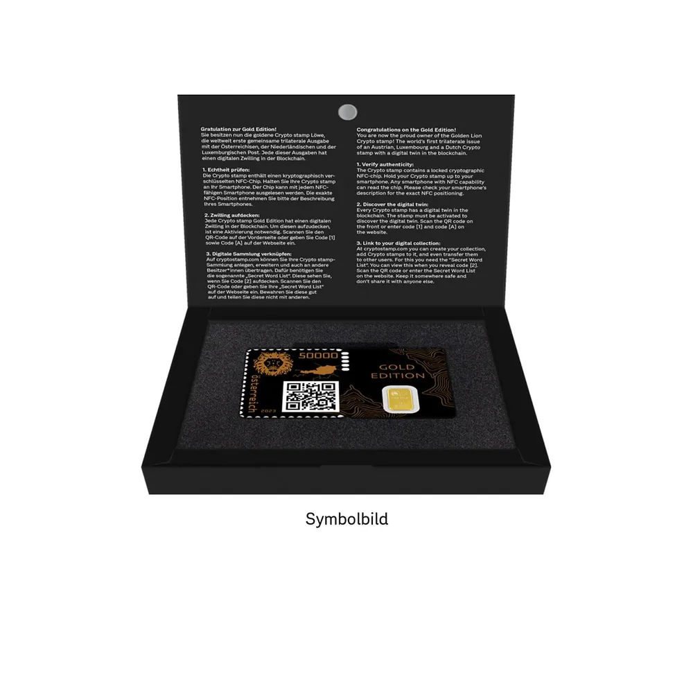 Als erste goldene trilaterale Gemeinschaftsedition in Österreich, den Niederlanden und Luxemburg, lässt die Crypto stamp Gold Edition Löwe internationale Sammlerherzen höher schlagen. Die Gold Edition Löwe ist länderübergreifend streng auf insgesamt 999 Stück limitiert und hat einen Nominalwert von € 500,-. Ob als Geschenk, Sammlerstück oder Wertanlage, die Gold Edition Löwe mit dem 1-Gramm-Goldbarren beeindruckt durch ihre Hochwertigkeit und Exklusivität. Der Goldbarren besitzt eine Legierung von 999,99 und wird vom Einhorn-Logo, dem Markenzeichen der Crypto stamp, geziert. Der Verkauf erfolgt ausschließlich über den jeweiligen Partner Online-Shop.