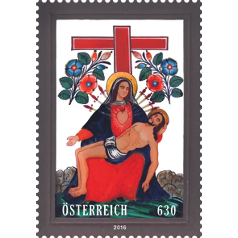 Mit dieser Glasmarke präsentiert die Österreichische Post eine ganz spezielle, exklusive Briefmarke und zeigt damit einmal mehr Innovationsgeist in Sachen Briefmarkendesign – weltweit wurde noch nie eine frankaturgültige Briefmarke aus Glas hergestellt. Die Glasmarke zeigt eines der berühmten „Sandlbilder“: eine Pietà in Hinterglasmalerei aus dem oberösterreichischen Ort Sandl. Bei der Hinterglasmalerei wird das Motiv auf der Rückseite des Glases aufgetragen, die Schauseite kann damit leicht gereinigt werden, was vor allem früher in vom Ofen verrauchten Bauernstuben von großem Vorteil war. Die Hinterglasmalerei hat große Tradition in Sandl. Das hängt damit zusammen, dass es in der Böhmerwaldlandschaft nahe Sandl viele Glashütten gab, bei denen die Glastafeln günstig und einfach bezogen werden konnten. Bäuerlichen Familien bot die Glasmalerei einen willkommenen Zusatzverdienst: In der Winterzeit waren alle Familienmitglieder daran beteiligt, die meist religiösen Motive in einzelnen Schritten aufzutragen – jeder hatte seine spezielle Aufgabe, z.B. das Auftragen der Konturen oder das Auffüllen der Flächen. Das traditionsreiche Motiv der Pietà, auch Vesperbild genannt, stammt aus dem 14. Jahrhundert. Es zeigt Maria, die ihren vom Kreuz abgenommenen Sohn Jesus beweint. Üblicherweise wird sie dabei alleine dargestellt, mit dem Leichnam ihres Sohnes im Arm. Vermutlich fand das Sujet der Schmerzensmutter durch die Andachtsbildchen, die die Gläubigen an das Leid Christi erinnern sollten, Einzug nach Sandl. Das vorliegende Hinterglasbild, das das Motiv der Glasmarke bildet, stammt aus dem letzten Viertel des 19. Jahrhunderts. Die Maler sind unbekannt – das Werk wurde, wie es üblich war, arbeitsteilig hergestellt. Auffällig sind die starken Farben und die ausdrucksstarke Pinselführung, die den Schmerz Marias und das Leiden Jesu besonders betonen. Die sieben Schwerter im Herzen Marias symbolisieren die sieben Schmerzen der Mater Dolorosa, der schmerzensreichen Mutter Maria, während die Blumenranken unterhalb des Kreuzes die Hoffnung darstellen, die das Opfer Jesu den Menschen bringt. Für die aufwendige Herstellung der Glasmarke zeichnet die Wiener Porzellanmanufaktur Augarten verantwortlich. Jeder Glasrohling wird händisch bearbeitet, die gesamte Produktion erfolgt nach ökologischen Grundsätzen. Das Motiv wird mittels lichtechten Pigmenten in einem speziellen Siebdruckverfahren mit der Hand auf der Rückseite des Glases aufgebracht. Danach wird die Farbe eingebrannt, das Motiv wird dadurch fest mit dem Glas verschmolzen und das Glas erhält eine besonders hohe Festigkeit. Die hochwertige, vorwiegend händische Herstellung, das außergewöhnliche Material und das traditionsreiche, handgemalte Motiv machen diese Glasbriefmarke zu etwas Besonderem: Volkstümliche Kunst und innovative Produktionstechnik werden so zu einem ganz speziellen kleinen Kunstwerk verbunden.