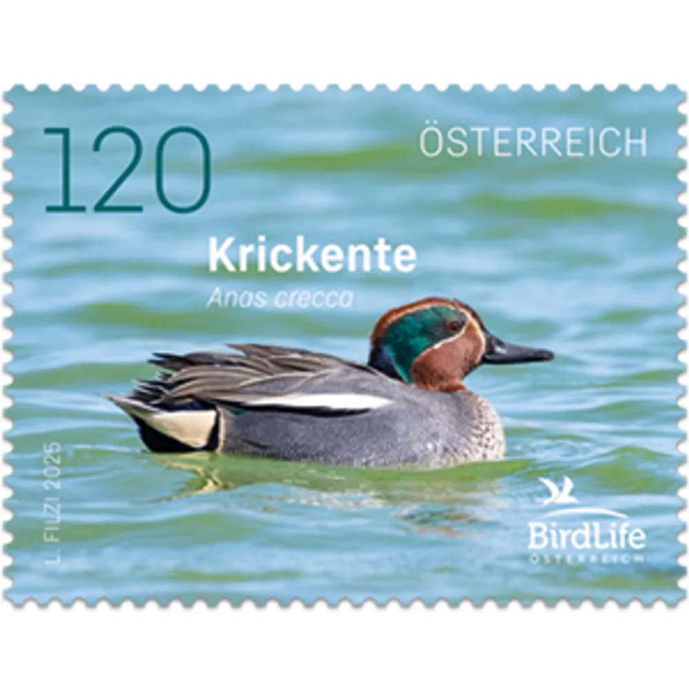 Die Krickente, Österreichs Vogel des Jahres 2025, ist das zweite Motiv der neuen Serie „Heimische Vögel“, in der die Österreichische Post in Kooperation mit BirdLife Österreich gefährdete Vögel vorstellt.
