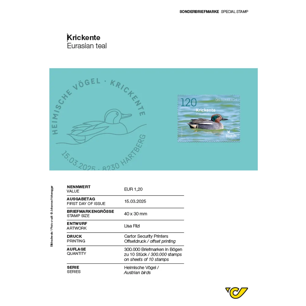 Die Krickente, Österreichs Vogel des Jahres 2025, ist das zweite Motiv der neuen Serie „Heimische Vögel“, in der die Österreichische Post in Kooperation mit BirdLife Österreich gefährdete Vögel vorstellt.