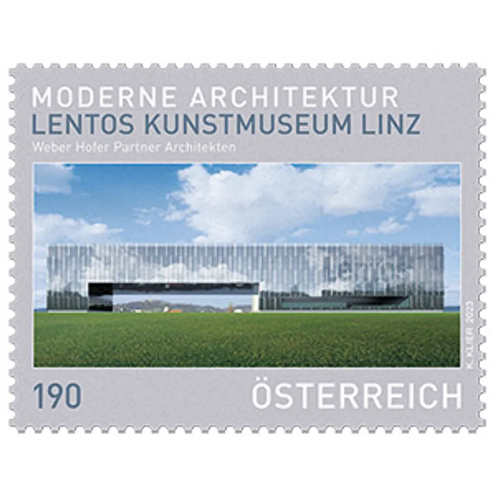Das markante Linzer Kunstmuseum Lentos feiert 2023 seinen 20. Geburtstag. Die Österreichische Post gratuliert zum Jubiläum mit einer Sondermarke aus der Serie „Moderne Architektur in Österreich“.