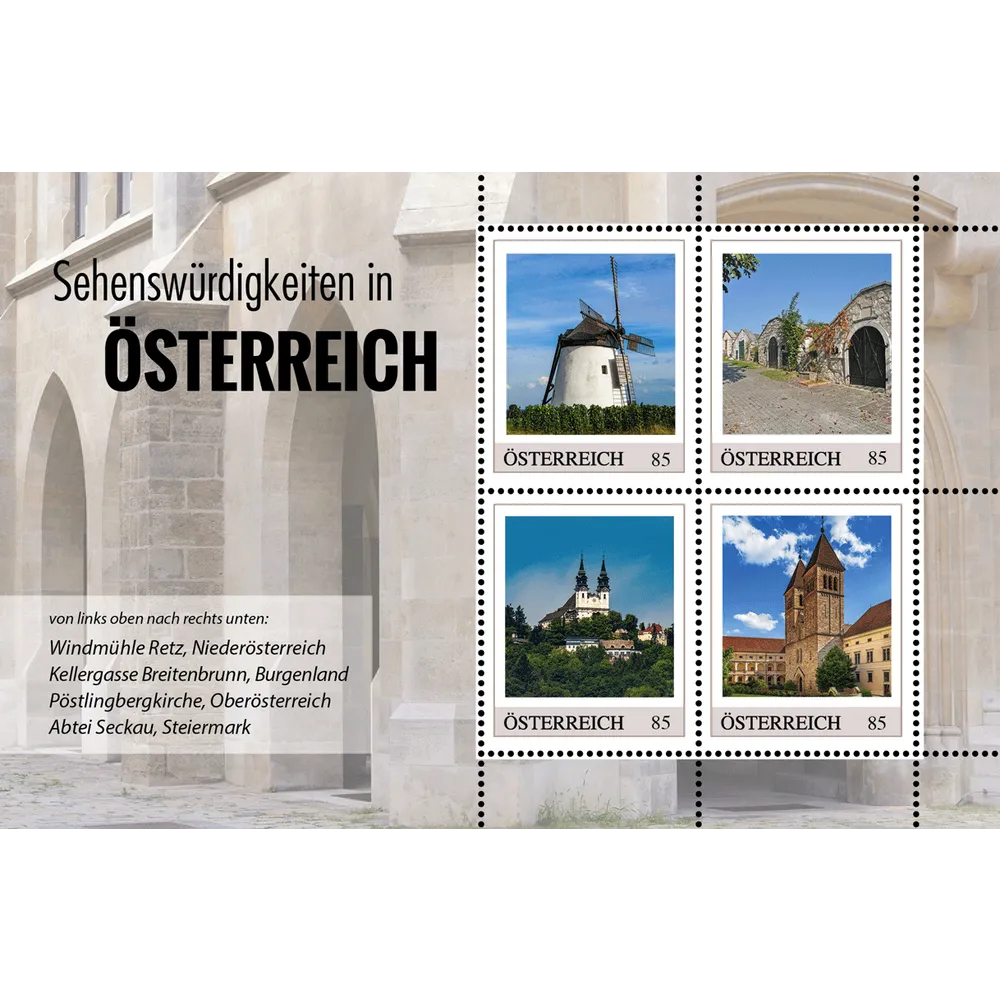 Windmühle Retz – Niederösterreich, Kellergasse Breitenbrunn – Burgenland, Pöstlingbergkirche – Oberösterreich, Abtei Seckau – Steiermark