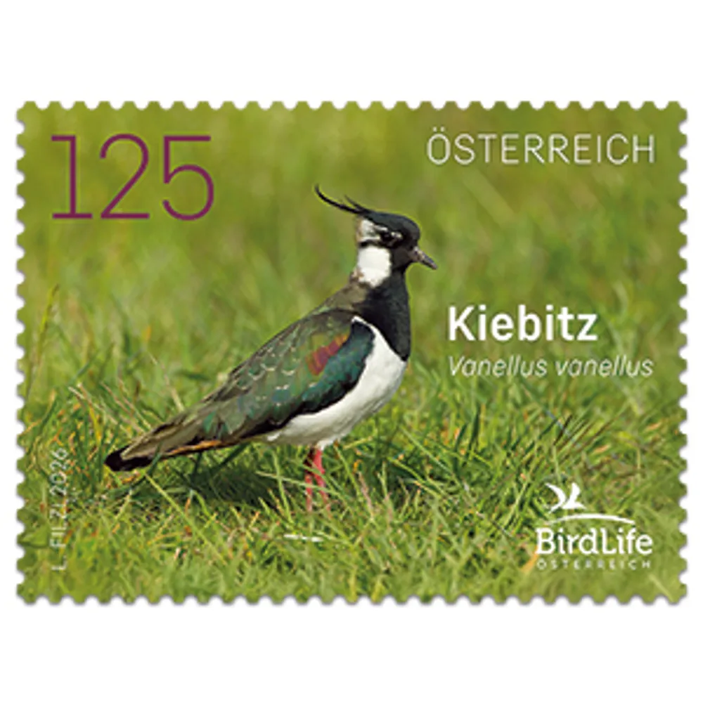 Der Kiebitz, Österreichs Vogel des Jahres 2026, ist das dritte Motiv der Serie „Heimische Vögel“, in der die Österreichische Post in Kooperation mit BirdLife Österreich gefährdete Vögel vorstellt. © Michael Dvorak
