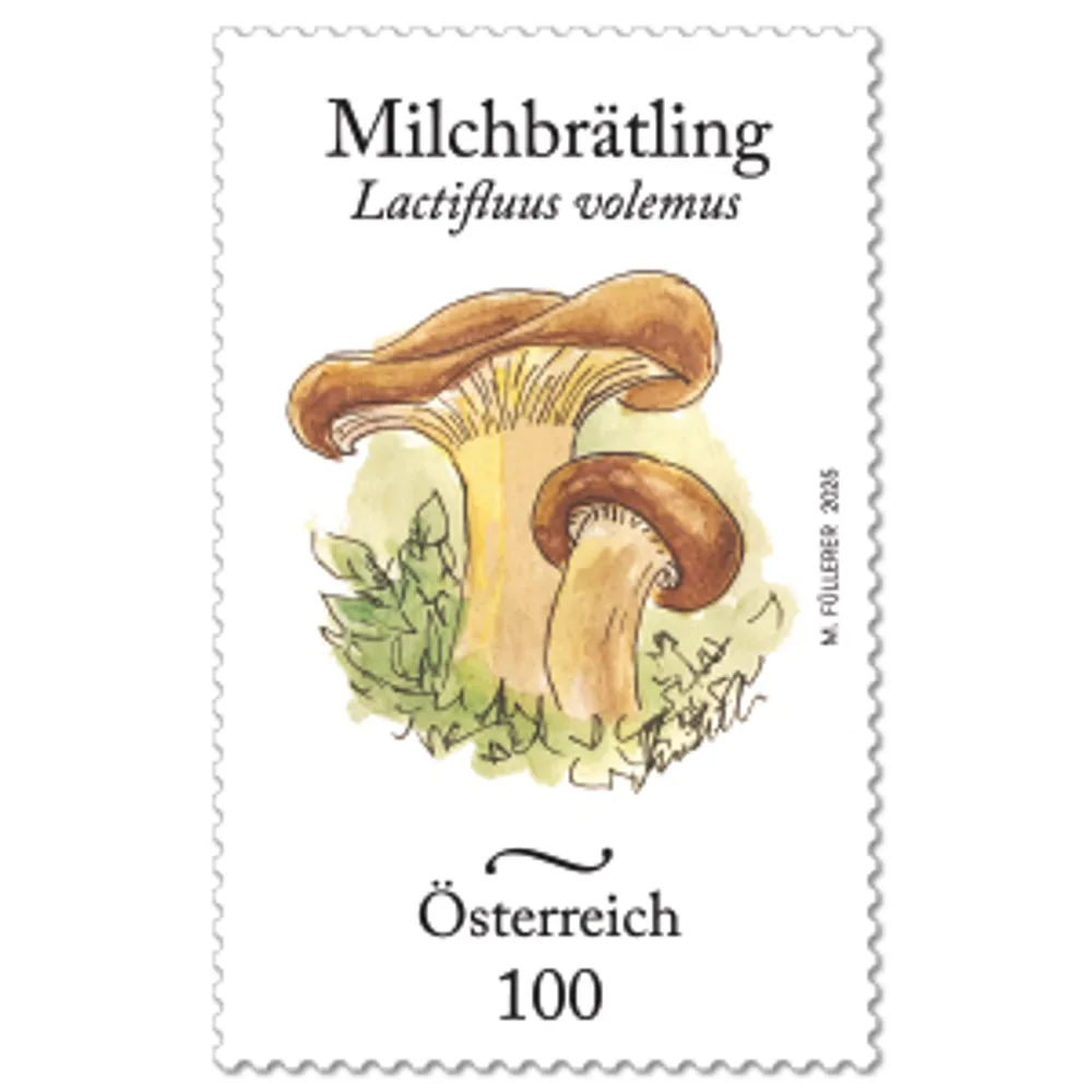 A lesser-known mushroom is featured on this year’s stamp in the “Austrian mushrooms” series: the weeping milk cap or bradling, which takes its name from the white liquid that seeps out when it is cut.