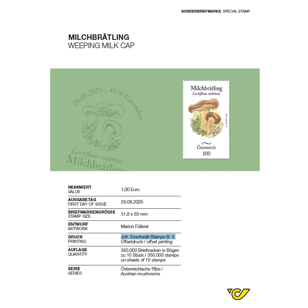 A lesser-known mushroom is featured on this year’s stamp in the “Austrian mushrooms” series: the weeping milk cap or bradling, which takes its name from the white liquid that seeps out when it is cut.