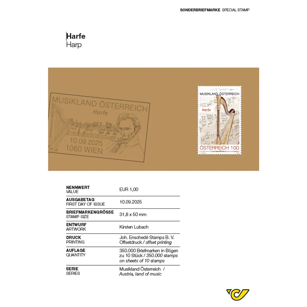 The harp, one of the biggest and heaviest instruments in an orchestra, provides the design for this year’s stamp in the “Austria, land of music” series.