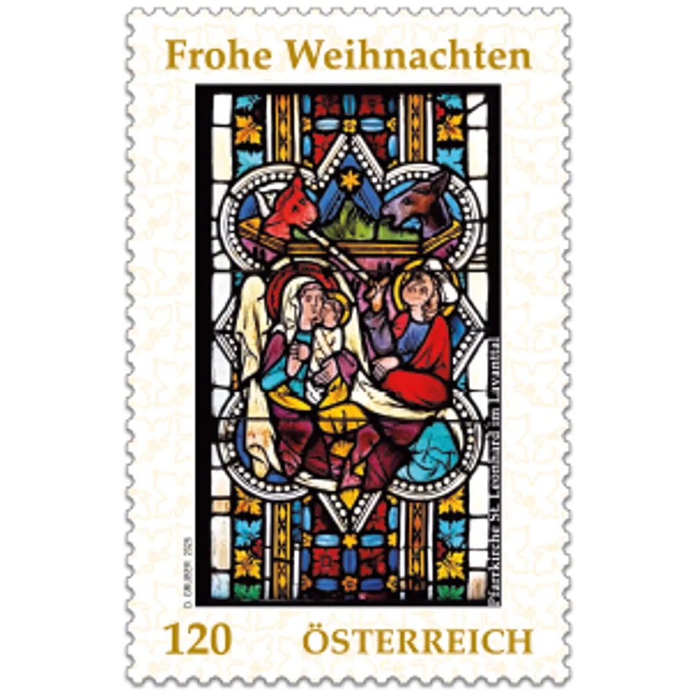 This Christmas stamp features an artistic Gothic stained glass window from the church, in which the Holy Family with the newborn baby Jesus is depicted.