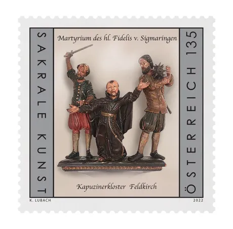Material number 0222160St. Fidelis of Sigmaringen is particularly venerated in the Capuchin monastery of Feldkirch. The colourful wooden sculpture on the commemorative stamp shows the saint’s martyrdom.