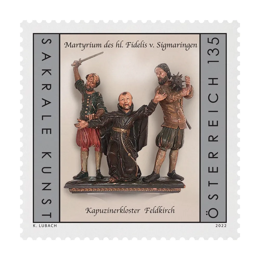 St. Fidelis of Sigmaringen is particularly venerated in the Capuchin monastery of Feldkirch. The colourful wooden sculpture on the commemorative stamp shows the saint’s martyrdom.