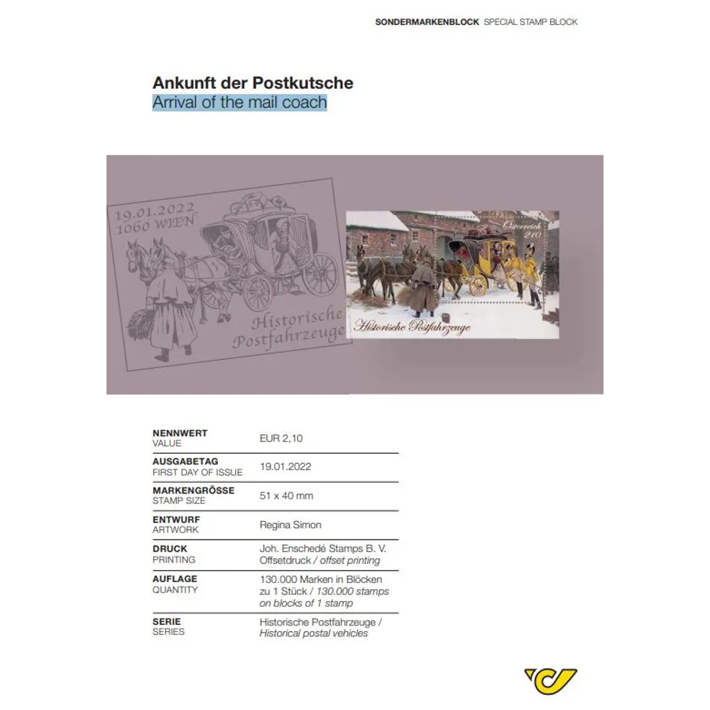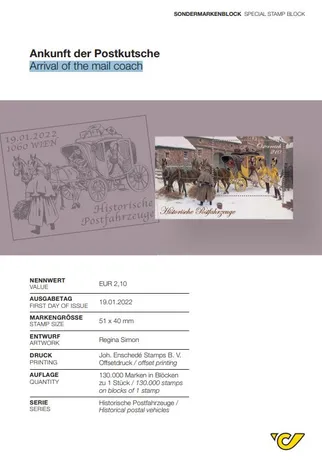 The subject of this year’s stamp in the popular “Historical postal vehicles” series is the picture on a postcard from the 19th century showing a four-horse-drawn mail coach in a snowy setting.