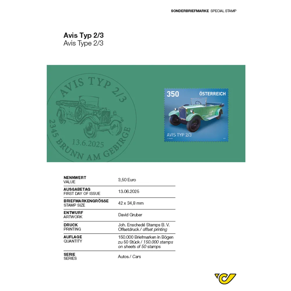 This year’s stamp for the “Cars” series Features a special model produced by a now little-known car manufacturer from Lower Austria: the Avis Type 2/3.