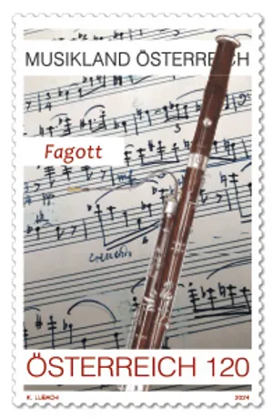 This special stamp in the series “Austria, land of music” presents the bassoon, the lowest instrument in the woodwind family.