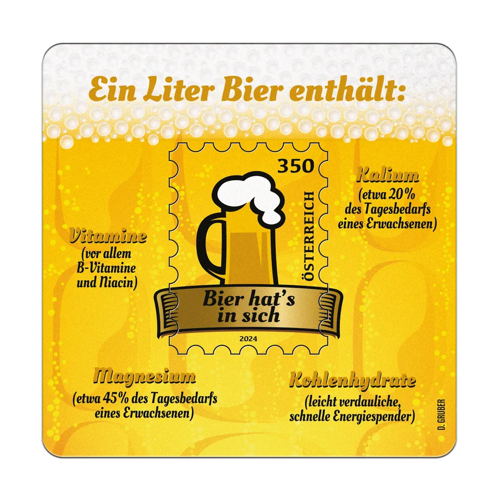 For this year’s technical innovation, Austrian Post is issuing an unusual miniature sheet in the shape of a beer-mat with a detachable stamp.
