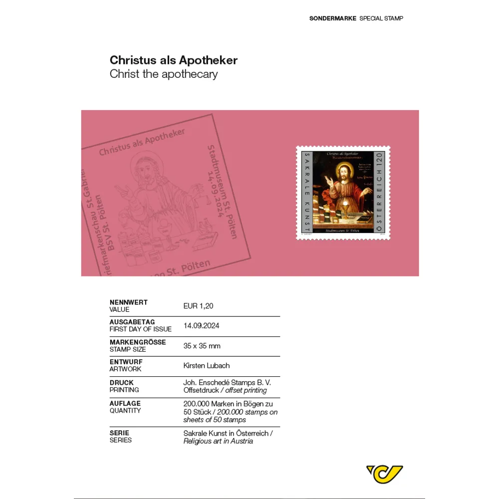 The second stamp in the series “Religious art in Austria” for this year shows a painting from the St. Pölten Museum in which Christ is depicted as an apothecary.