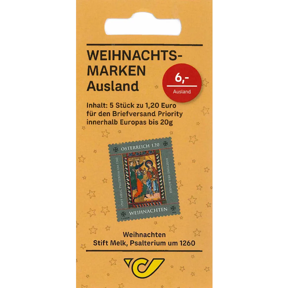 An image taken from a valuable illuminated manuscript from Melk Abbey is featured on this Christmas stamp dedicated to sacred art. It shows the three wise men worshipping the baby Jesus.