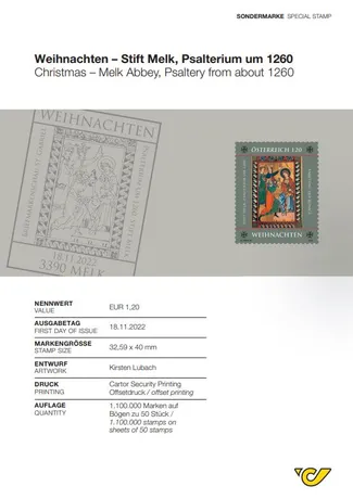 An image taken from a valuable illuminated manuscript from Melk Abbey is featured on this Christmas stamp dedicated to sacred art. It shows the three wise men worshipping the baby Jesus.