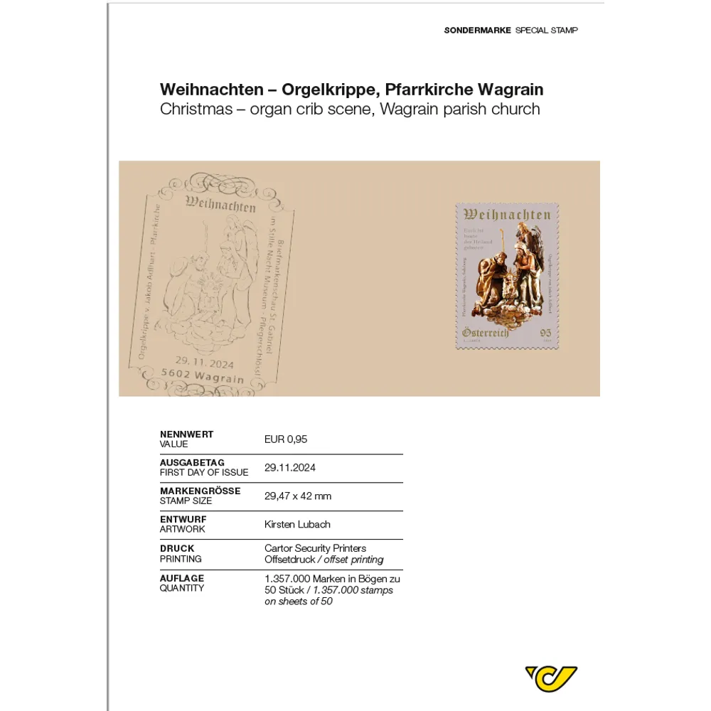 This Christmas stamp, embellished with hot stamping foil, shows the organ crib scene with a sculpture of the Holy Family from the parish church of Wagrain in the province of Salzburg.