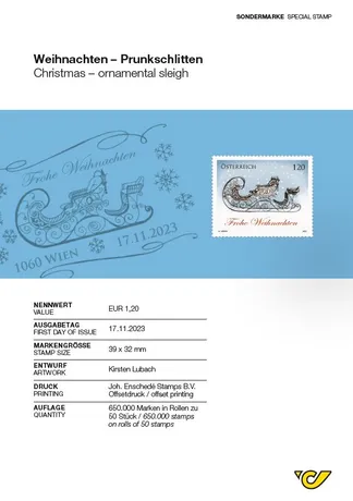 This Christmas stamp shows a nostalgic ornamental sleigh, making us yearn to take a sleigh ride through the snow-covered winter landscape.