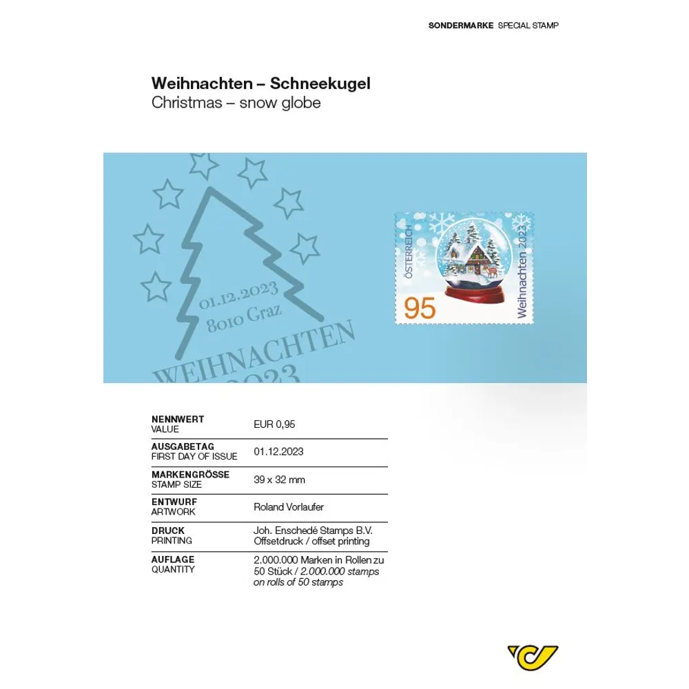 A wintry scene within a snow globe is the design on this Christmas stamp. It awakens our anticipation and excitement about Christmas, winter and snow.