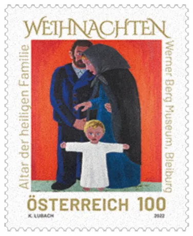 The design on this stamp is the central panel of the alter of the Holy Family, which depicts the Christmas story. It is on display in the Werner Berg Museum in Bleiburg/Pliberk in Carinthia.