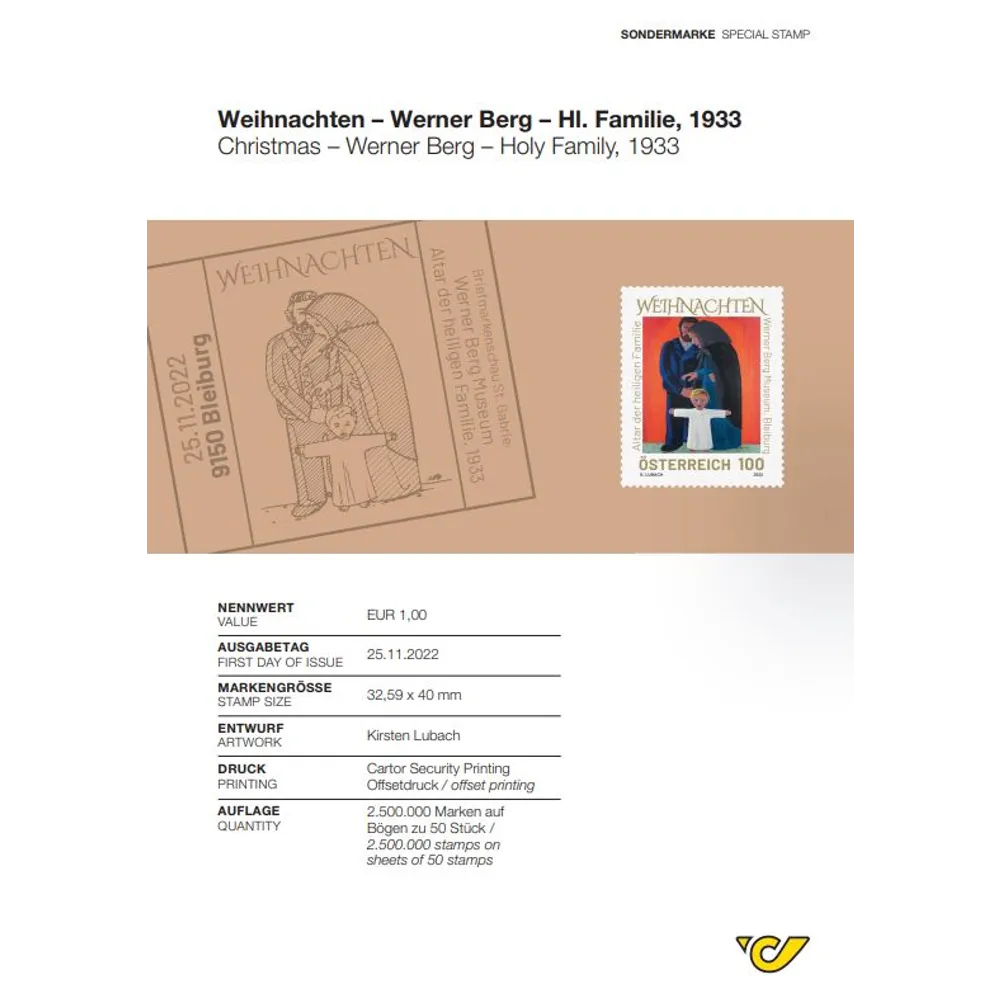 The design on this stamp is the central panel of the alter of the Holy Family, which depicts the Christmas story. It is on display in the Werner Berg Museum in Bleiburg/Pliberk in Carinthia.