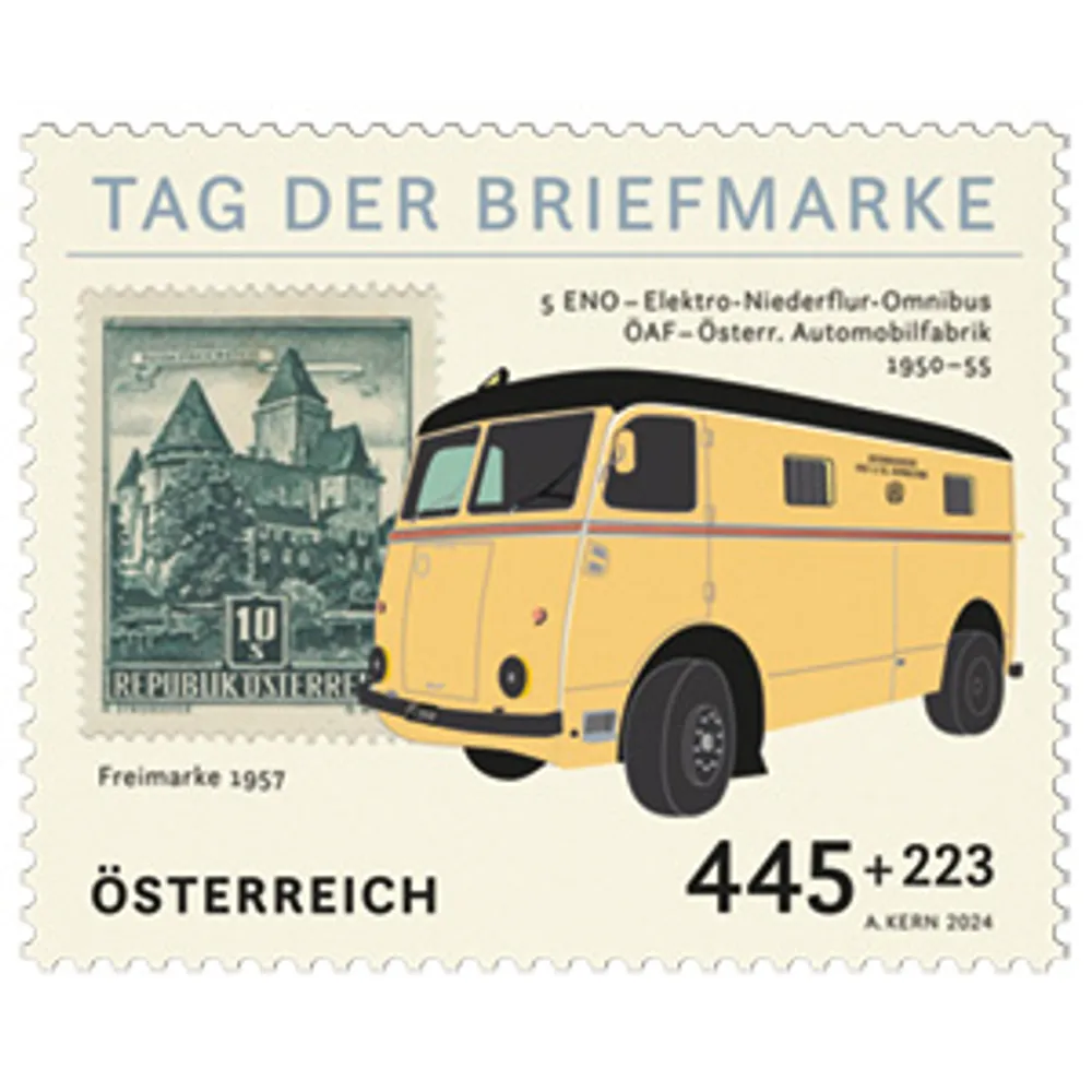 Once again, the topic for this year’s design for the Day of the Stamp is electromobility in the Austrian postal service, this time looking at the 1950s.