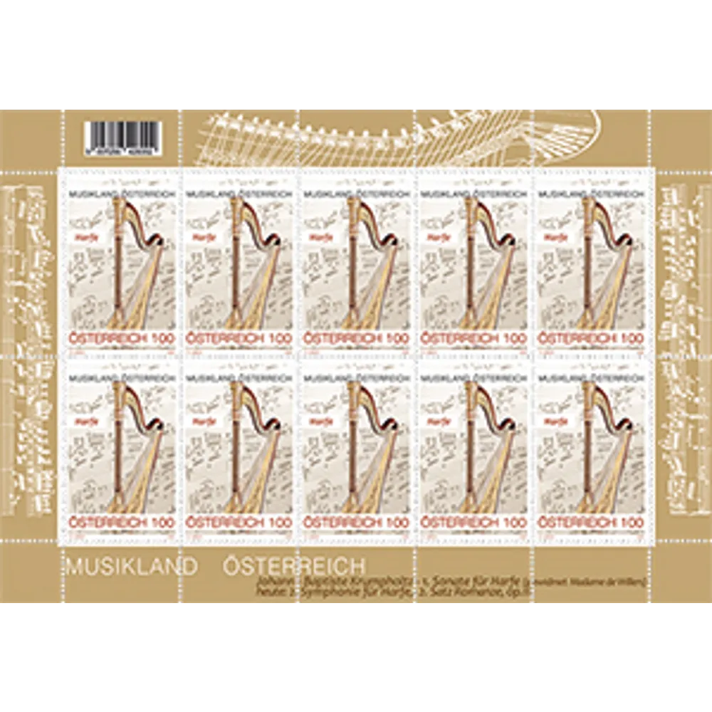 The harp, one of the biggest and heaviest instruments in an orchestra, provides the design for this year’s stamp in the “Austria, land of music” series.