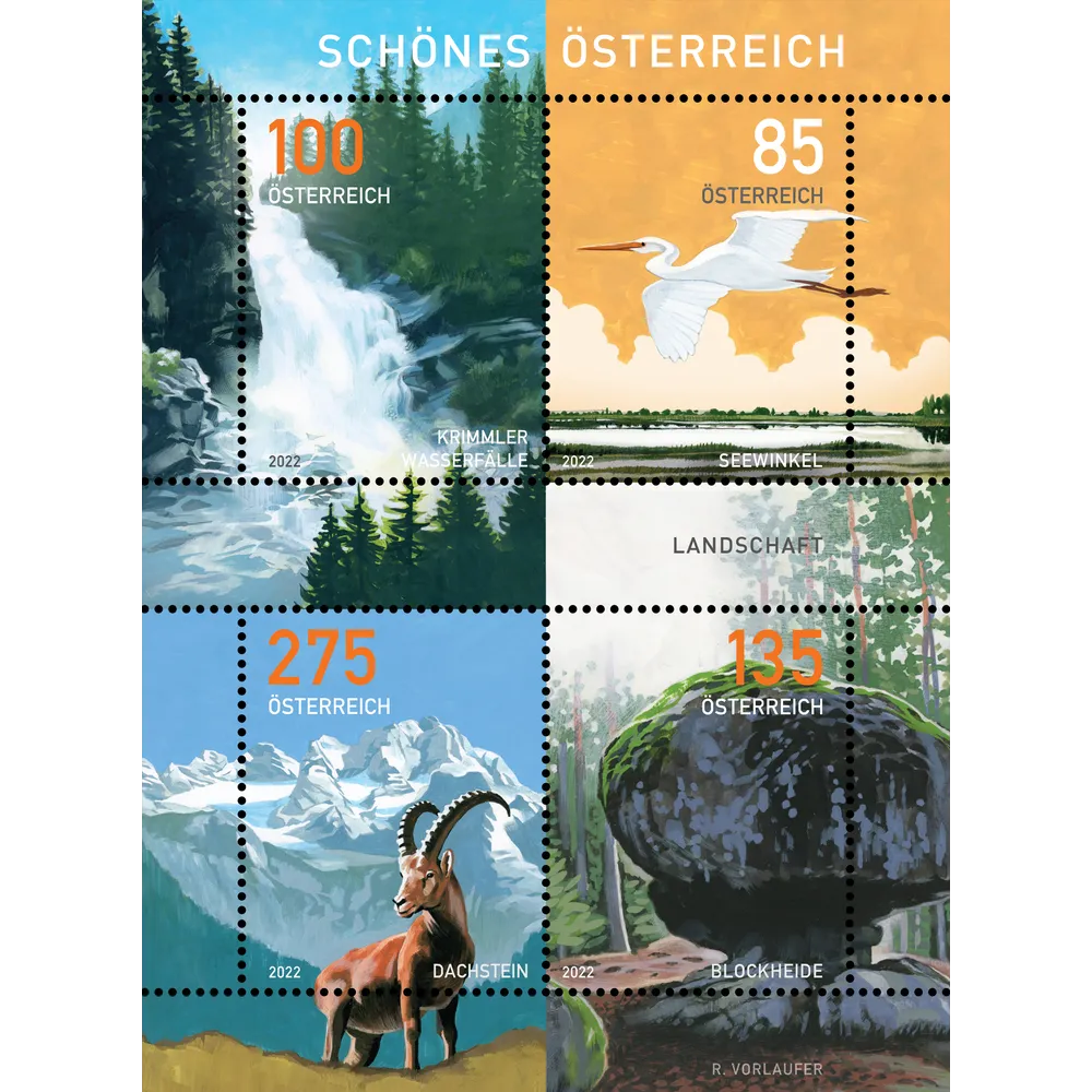 A new block of stamps for the “Beautiful Austria” series in the style of the dispenser stamps shows a selection of the diverse landscapes Austria has to offer.