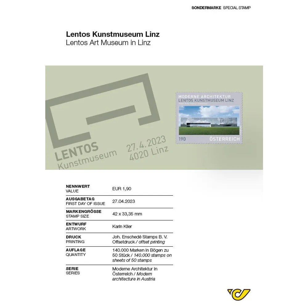 The eye-catching Lentos Art Museum in Linz is celebrating its 20th anniversary in 2023. Austrian Post is congratulating it with a commemorative stamp in the “Modern architecture in Austria” series.