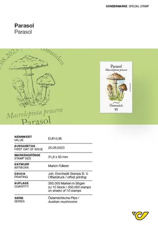 The subject of this year’s stamp in the “Austrian mushrooms” series is the parasol mushroom. It is one of the biggest and most popular indigenous edible mushroom varieties in Austria and is a tasty treat.