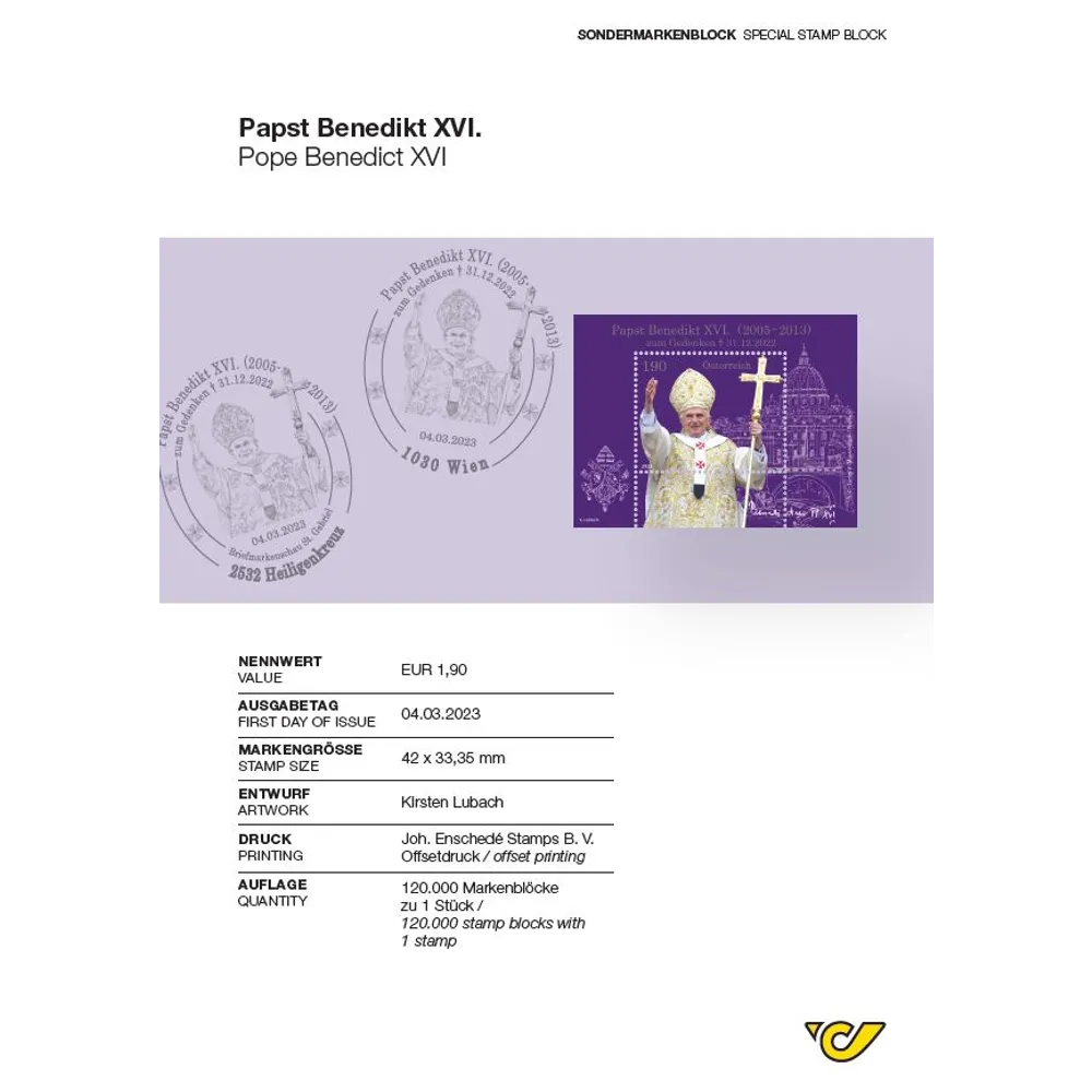 On the occasion of the death of Pope Emeritus Benedict XVI, Austrian Post is issuing a ommemorative stamp block to celebrate his memory.