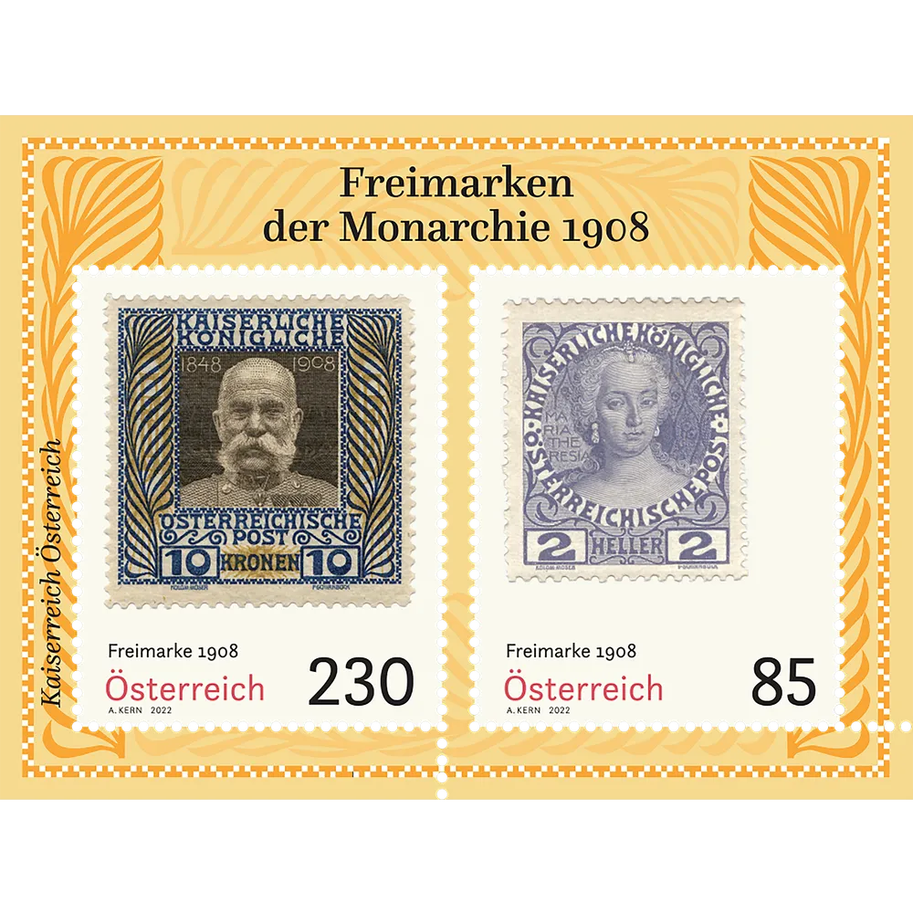 Material number 0222110On the occasion of the 60th anniversary of the reign of Emperor Franz Joseph, an unusual series of postage stamps was issued on 1st January 1908, which for the first time also featured the portraits of earlier monarchs.
