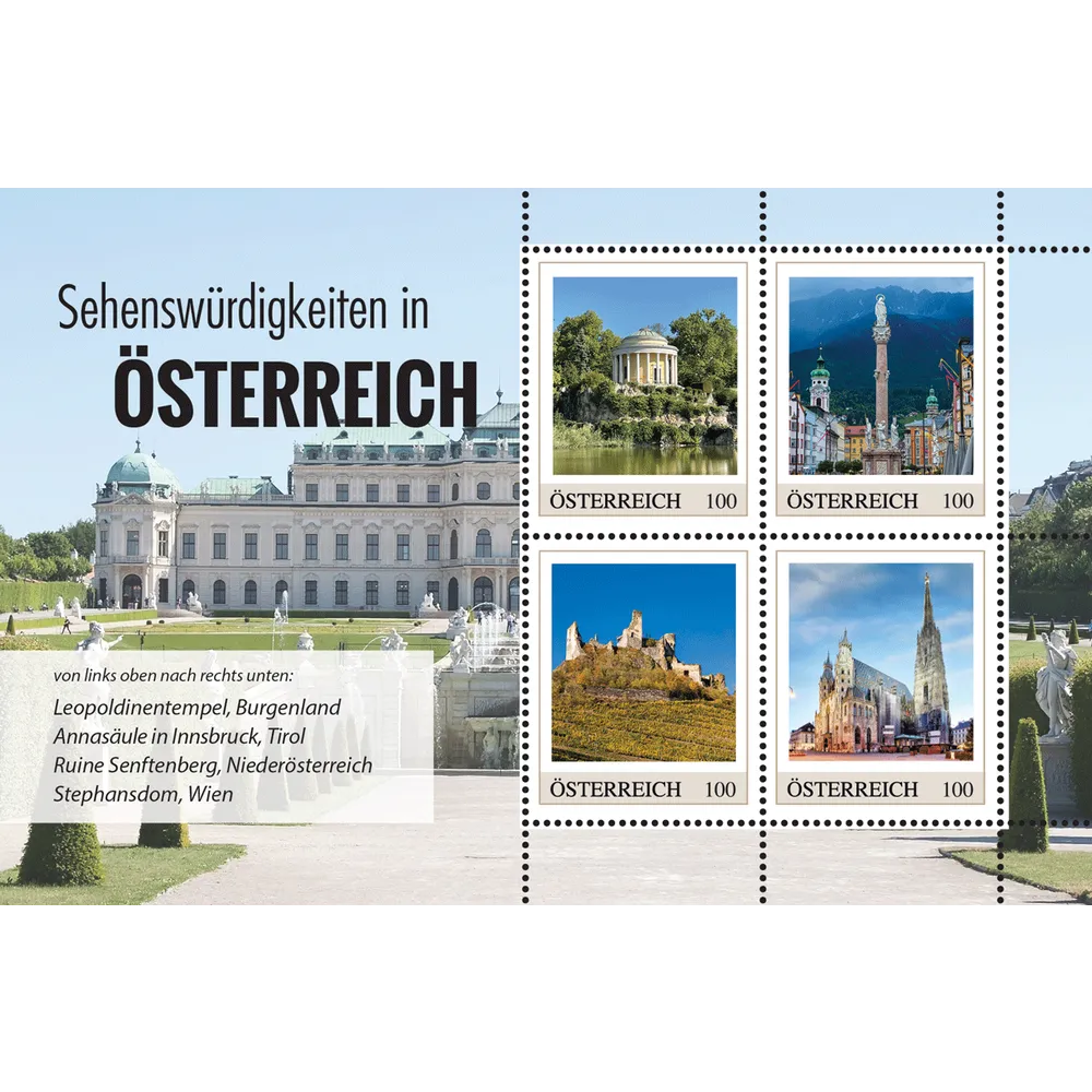 Leopoldine Temple, Burgenland; St. Anne’s Column in Innsbruck, Tyrol; Senftenberg Castle ruins, Lower Austria; St. Stephen’s Cathedral, Vienna