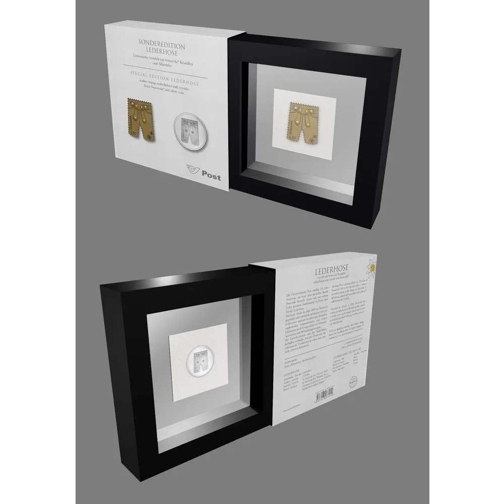 with the special-issue stamp "Lederhosen" and a silver dollar with a depiction of "lederhosen" in an exclusive frame (silver dollar alloy: pure silver; purity 999.0)