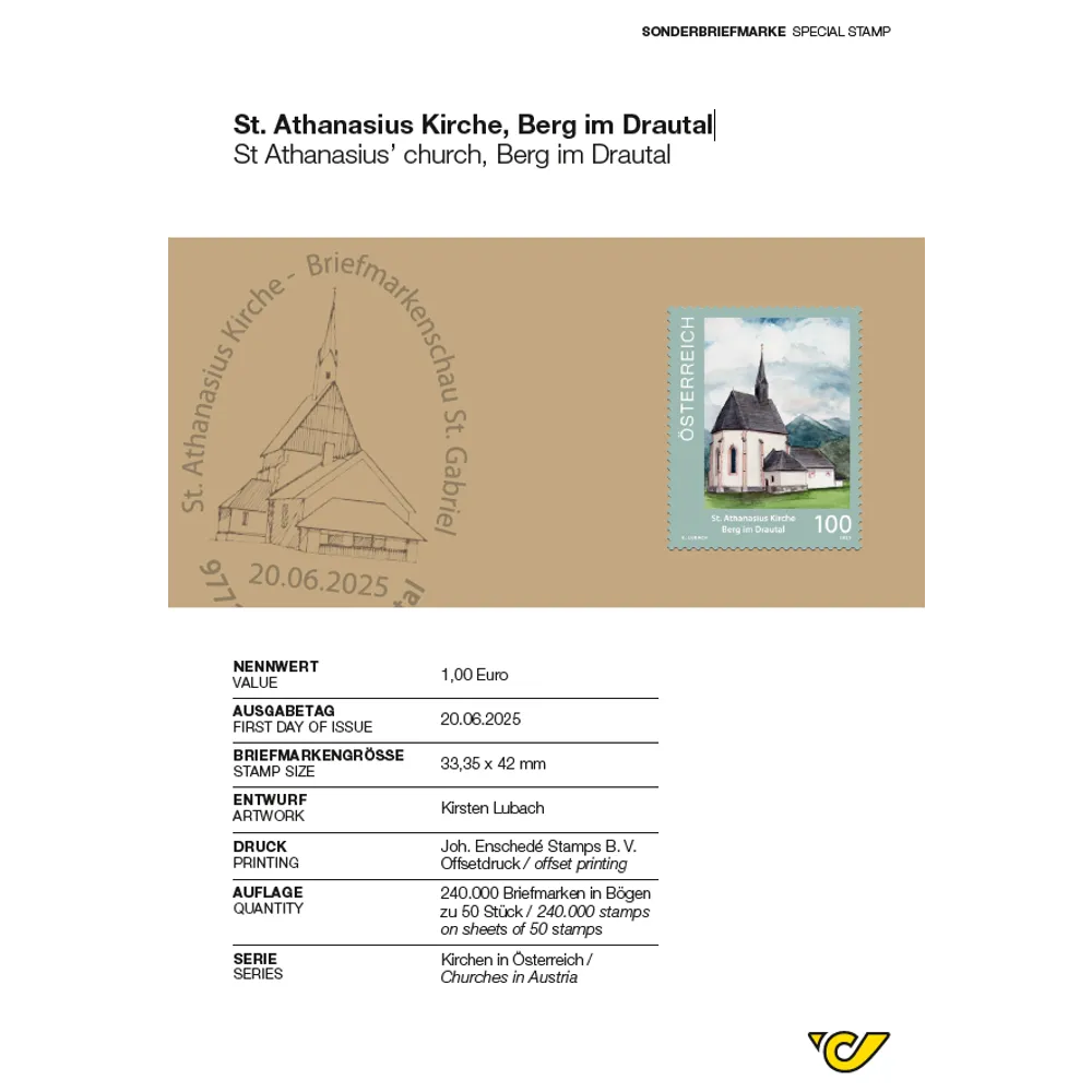 The former pilgrimage church of St Athanasius, also known as St Athanas, in the Carinthian municipality of Berg im Drautal is the subject of this year’s stamp in the “Churches in Austria” series.