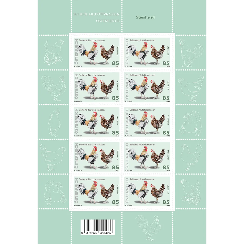 The second stamp in the “Rare farm animal breeds” series shows the Steinhendl, a particularly small and versatile old indigenous chicken breed with unusually colourful feathers.