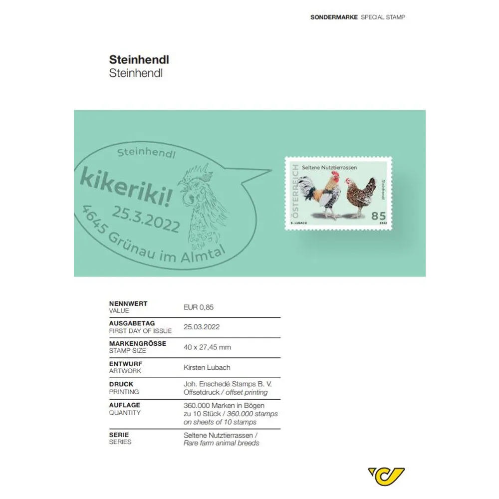 The second stamp in the “Rare farm animal breeds” series shows the Steinhendl, a particularly small and versatile old indigenous chicken breed with unusually colourful feathers.