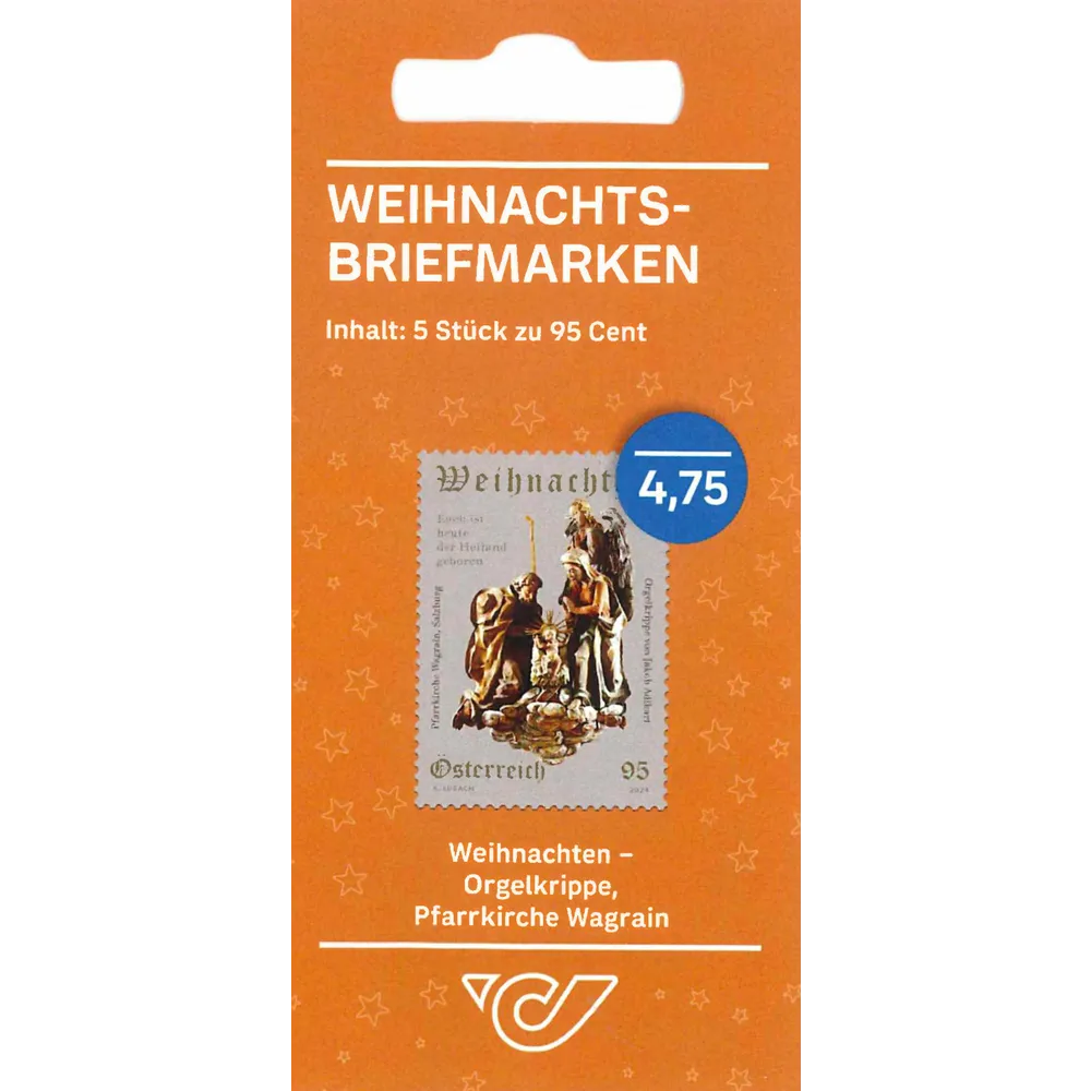 This Christmas stamp, embellished with hot stamping foil, shows the organ crib scene with a sculpture of the Holy Family from the parish church of Wagrain in the province of Salzburg.